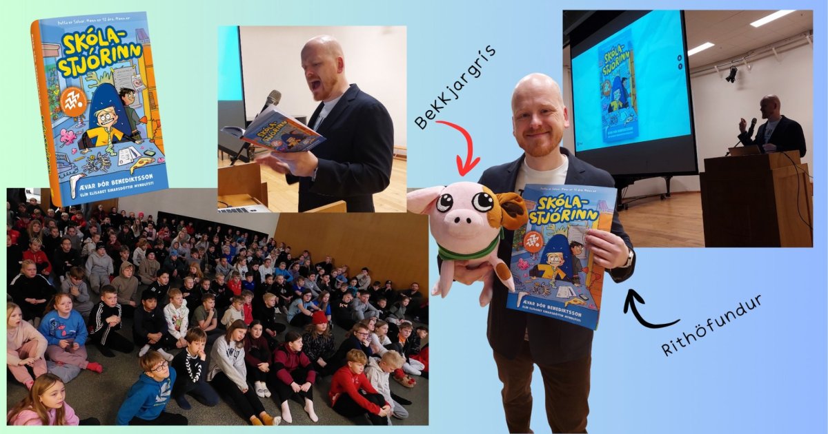 Ævar Þór og bekkjargrísinn komu í heimsókn í dag og sögðu okkur frá Salvari, sem óvænt verður skólastjóri, aðeins 12 ára gamall en sagan um hann Salvar hlaut barnabókaverðlaun Guðrúnar Helgadóttur. Ævar hafði orð á því hvað krakkarnir voru flottir og hlustuðu vel og áhuginn var svo mikill að aðeins hálftíma síðar voru komin 24 nöfn á biðlista eftir bókinni á skólasafninu!